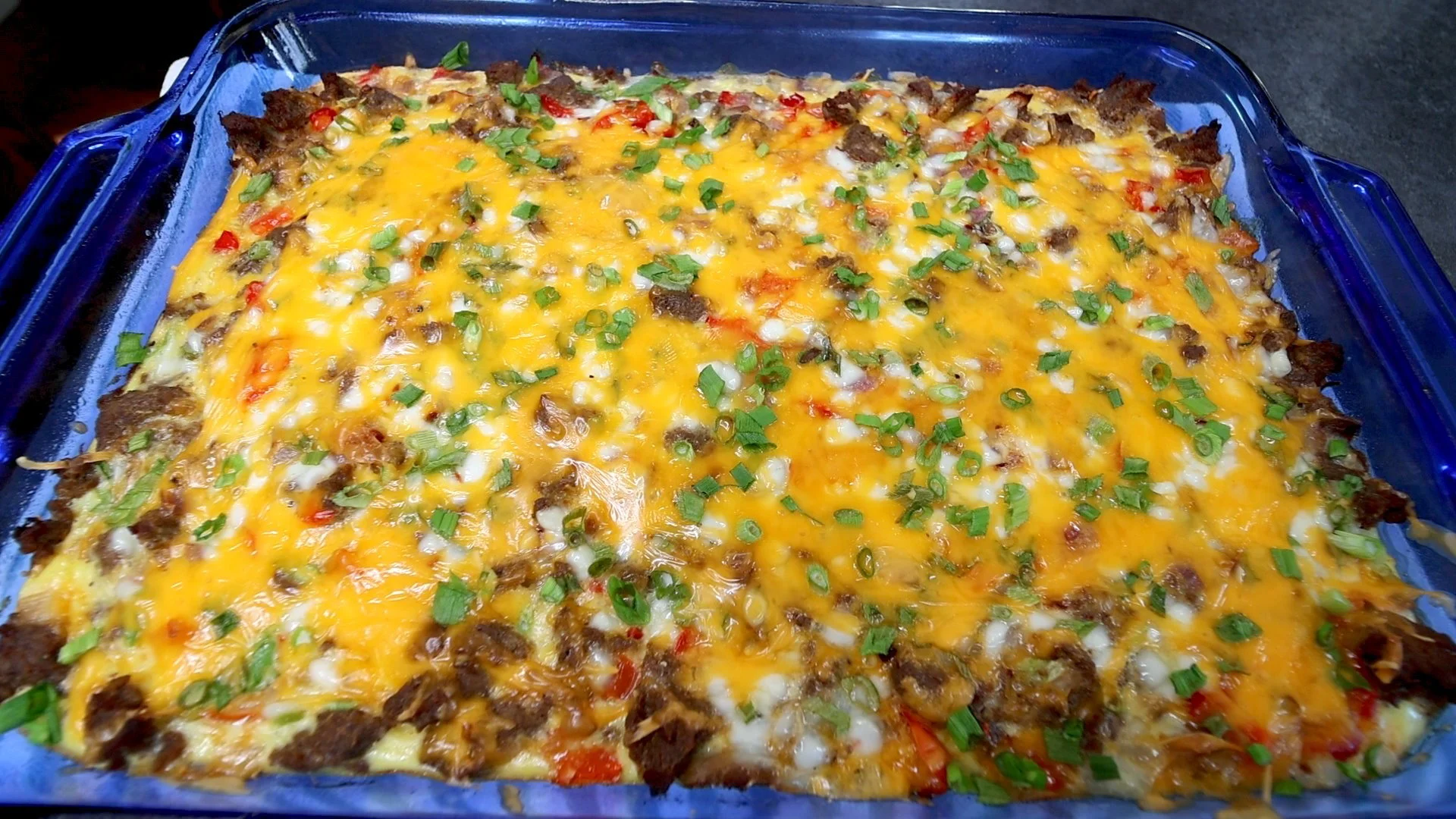 Pour the egg mixture over the sausage and hash browns.